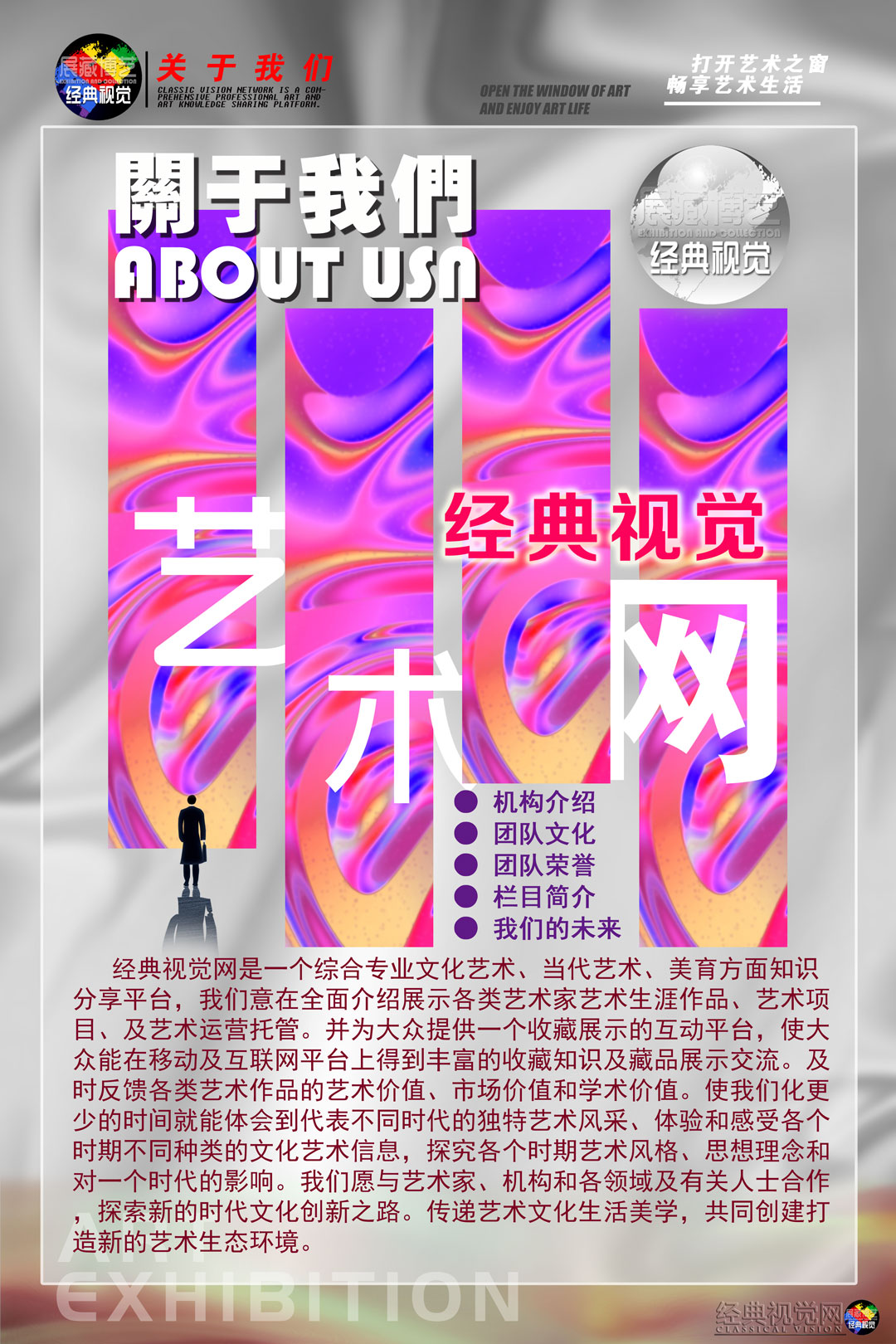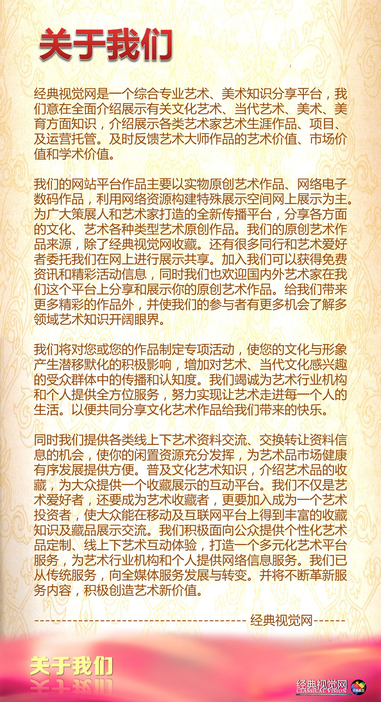 经典视觉网是一个综合专业艺术、美术知识分享平台,我们意在全面介绍展示有关文化艺术、当代艺术、美术、美育方面知识,介绍展示各类艺术家艺术生涯作品、项目、及运营托管。及时反馈艺术大师作品的艺术价值、市场价值和学术价值。也是一家集网络新媒体、文化交流一体的综合性文化传播平台。本着“诚信、务实、创新、共赢”的理念,以全方位的资源网络提供优质的网络服务。平台有强大的整合传播实力,凭借管理团队的丰富经验和强大的网络优势,致力于文化的传播与交流,以与时俱进的理念,强大的网络平台、专业的制作团队、熟悉艺术市场的文化团队以及具特色的传播渠道,竭力打造文化新形象,开拓艺术新市场,
