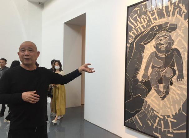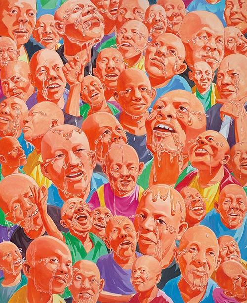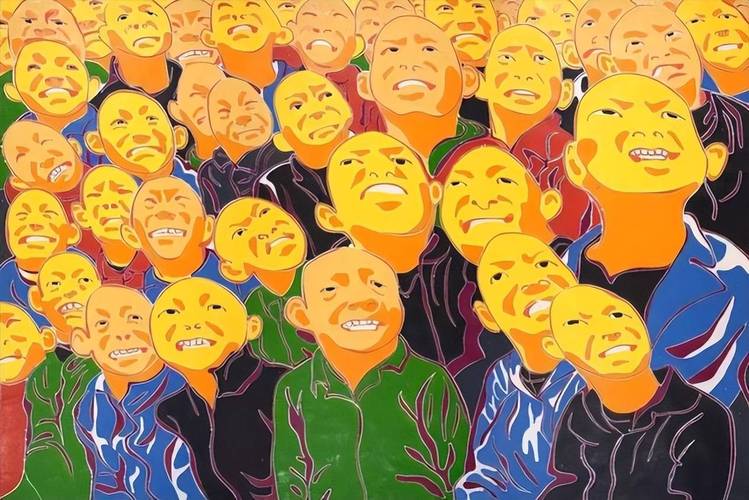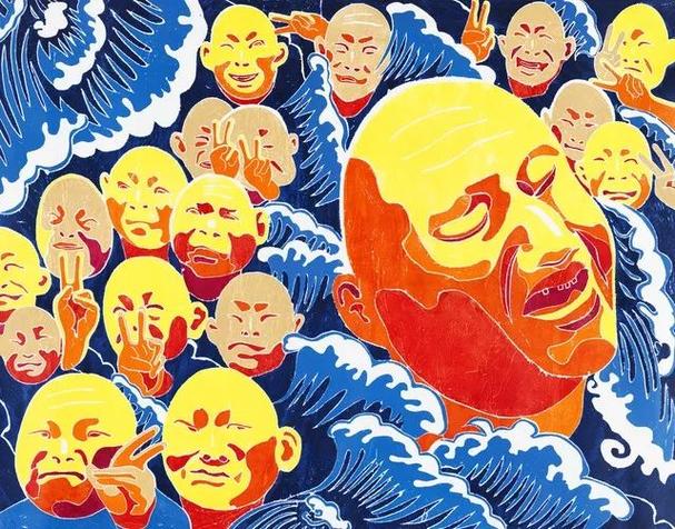 进入上世纪90年代后,方力钧渐渐为艺坛所关注。第一阶段是所谓“玩世现实”,这是方力钧对当时自身的社会地位和社会关系进行的一系列视觉反思。他用调侃的手法把自我生活的荒诞感描写出来,用夸张的和戏剧化的手法来表现自我或一个个小人物打哈欠和怪笑的形象,以这些形象来嘲讽倾斜的社会世态与失衡的曰常生活。在2000年第3届上海双年展上,方力钧展出了两幅大型版画,将玩世现实的精神与理念推向了又一个高峰,这是他创作中的一个重要转折。方力钧的巨幅版画又回到了革命的现实主义宏大构图的模式中去借力,巨幅中成干上万的仰首人头,或痴呆,或木然,或无助,方力钧敏锐且有力地揭示出这个时代的普遍性,他是以这群远望天空的人来象征一代平民的集体情绪与共同境遇。这是纪念碑式艺术在当代中国艺术中的一个绝佳范例,方力钧以此作为中国平民跨入21世纪的现场,进行泼墨般的集体精神造像。