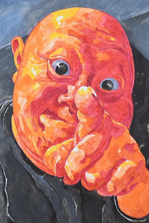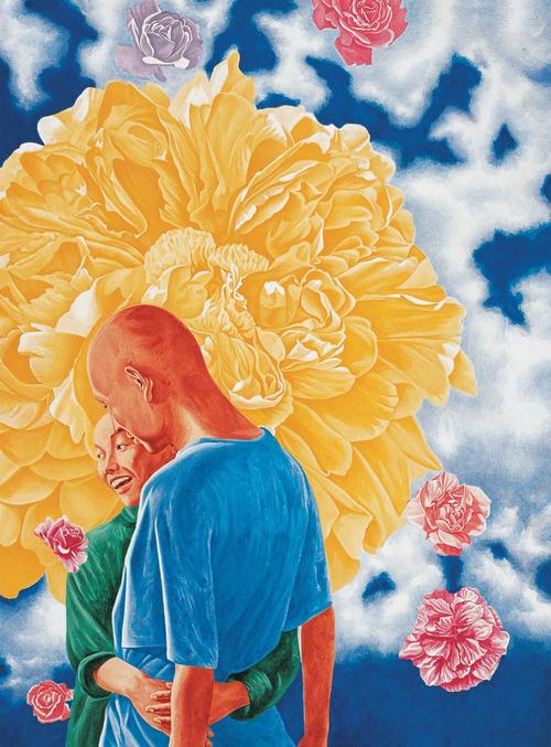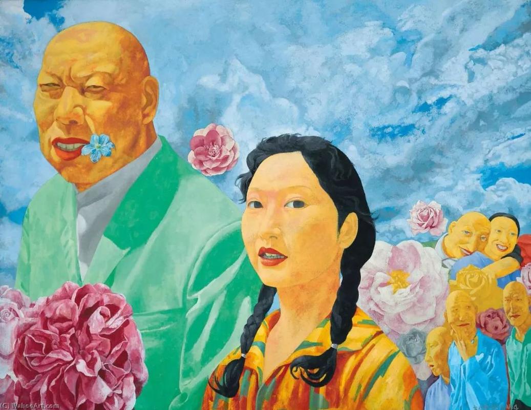 方力钧的第二个转折,就是画面中出现了一个飞翔在天空中的小孩子,这就是方力钧进入象征主义的开端:云上的小孩子不仅仅 是在一览众山小,而且象征着一种自由飞舞的文化灵魂。他脱离了所谓的客观的现实世界或主观的玩世现实,来讨论真实的与可视的现实世界,而是自己开创了一个多种视角的多元图像。