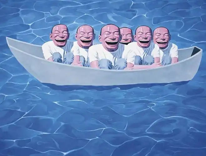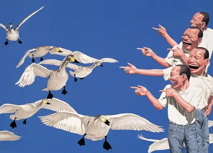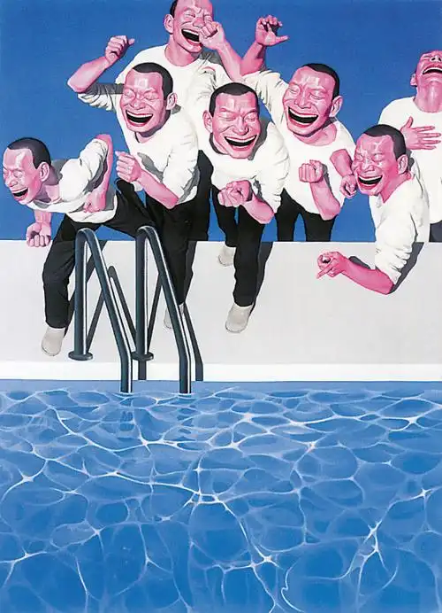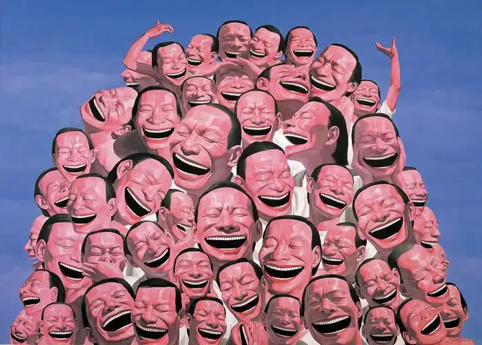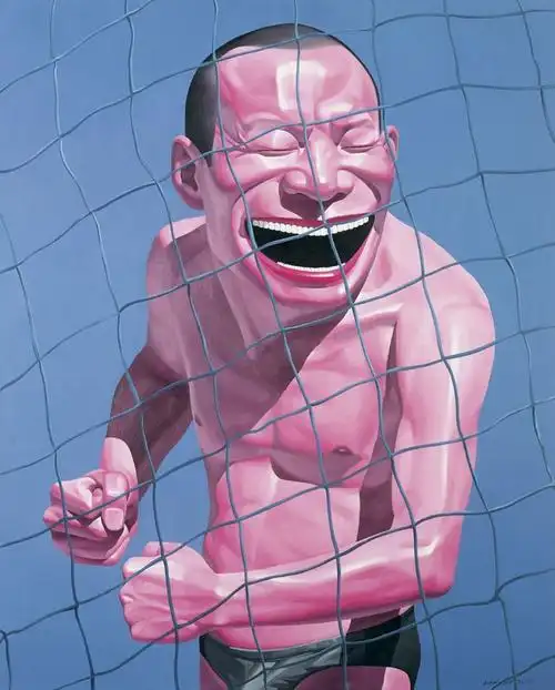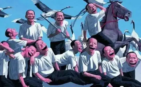 他作品中总是以光鲜的头形、夸张的肢体、嘻哈的大嘴及细密的小白牙等人物形象的复数性排列来呈现的,这些造像构成和贯穿了岳敏君艺术的符号化特征。其观念的背景支撑则来自于所谓的现代化工业文明的特征之一,即强调标准化、重复性、复制性。另一方面是他作品中利用了中国社会主义宣传画和消费主义时代广告性的话语方式。他早期的许多画面都是以天安门、红旗、 太阳、标语、红灯笼、红气球、军帽等为背景。在他20世纪90年代末期到近几年的一些作品的画面背景出现了风景、园林、花鸟、动 物,甚至天空、宇宙等等“闲云野鹤”式的唯美图式。既有个人成长的经验记忆,又有时代审美趣昧的变迀,构成了中国社会转型的生 活烙印。从这一角度考察,岳敏君的作品恰恰适应或对应了现代化社会和中国急于现代化发展的本质特征,换句话来说,他的作品从 某种角度在测度或凸现着中国社会转型期的现实变化。这些年来他所创作的系列作品基本上是以自己的形象为模特的,或者说他对我们时代文化的敏感及提升是以为“自己” 造像为切入点的。“时尚”正在成为我们这个时代的标志和面孔,而“自己”恰如是这一标志性面孔的表情,将在商业文化影响下流行 的矫揉造作的姿态和暖昧矫饰心理状态滑稽而夸张地表现出来,试图把当代中国正在兴起的消费社会中的时尚化、虚拟化生活加以 典型化波普化地处理,勾勒出这个时代物质与精神崇拜的生动且荒诞的情境,而戏谑的语言背后隐含的是他对当下生活的深刻关注 以及严肃认真的反思。