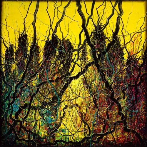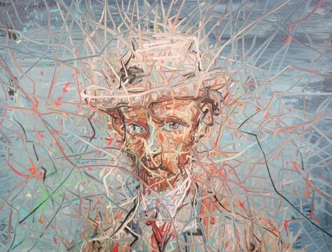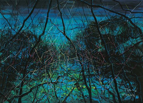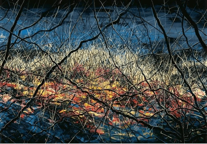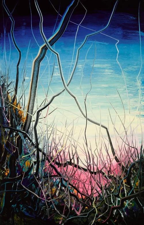 曾梵志在20世纪90年代早期受表现主义画家、抽象表现主义艺术家的影响较多,这个时期的作品人物造型扭曲夸张,画风粗犷;90年代后期作品转向具有典型波普图像特征;进入2000年后,开始转向具有中国传统图示特征的“抽象风景”系列,同时用线消解图像的完整性。从表象上看是受中国传统风景图示特征和使用中国传统造型元素——线条的表现力,风景中炫目艳丽的夜景被各种杂乱的荆棘——具象化的线条所粗暴的分割和羁绊。从绘画本体语言上看,曾梵志2000年前的作品是通过形象和图像的完整性来营造表达他的主题,从2000年后,他致力于消极图像的完整性,从而将自己从图像的桎梏中解放出来,他尝试过用机械性的笔触来消解画面,直到他找到了抽象风景系列,他通过先描绘景观(夜景),再用新的景观(如荆棘枝条)颠覆和破坏原有景观,达到一种充满戏剧冲突感的画面,象征与写实并置,抽象和具象互现,静谧绚烂与粗暴撕裂交织一体,这是他为自己本来的擅长的残酷主题寻找到的全新的表现世界。